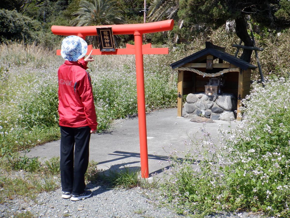 ↑ 「弓ヶ浜」の隣のタライ岬遊歩道の入り口付近「逢ヶ浜」に移動して昼食・・🍱 🍜 ☕ 駐車場の隅にはこんなにかわいい「龍権神社」がある・・・😊😊