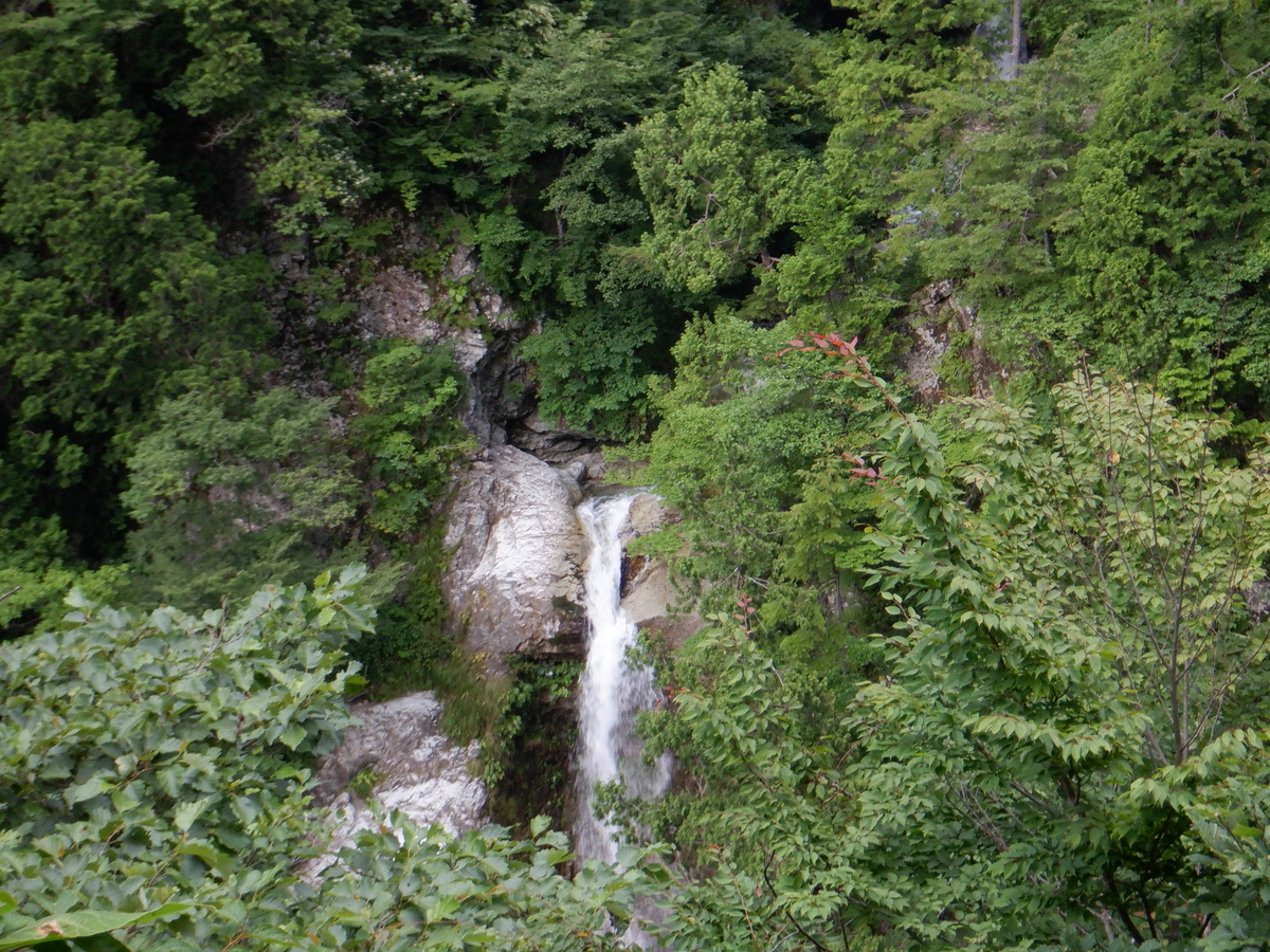 「姥ヶ滝」は「日本の滝100選」の1つで、岩肌に沿って落ちる数万条の流れは圧巻なのだそうだが、到着した時にちょうど管理されている係の方が来て、本日は終了ということで、鎖をかけに来た 😭 でも、少し白川郷方面に戻った所の道路脇停車場に車を停めれば、上から眺めることができることを教えてくれた。ありがたい😊😊