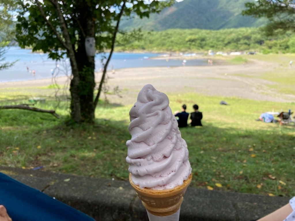 ↑ 今日のおやつ・・ソフトクリーム「ブルーベリーヨーグルト味」🍦🍦🍦 ここのソフトクリームは300円・・👍👍😊 観光地にしては良心的な値段だ・・¥¥¥👍
