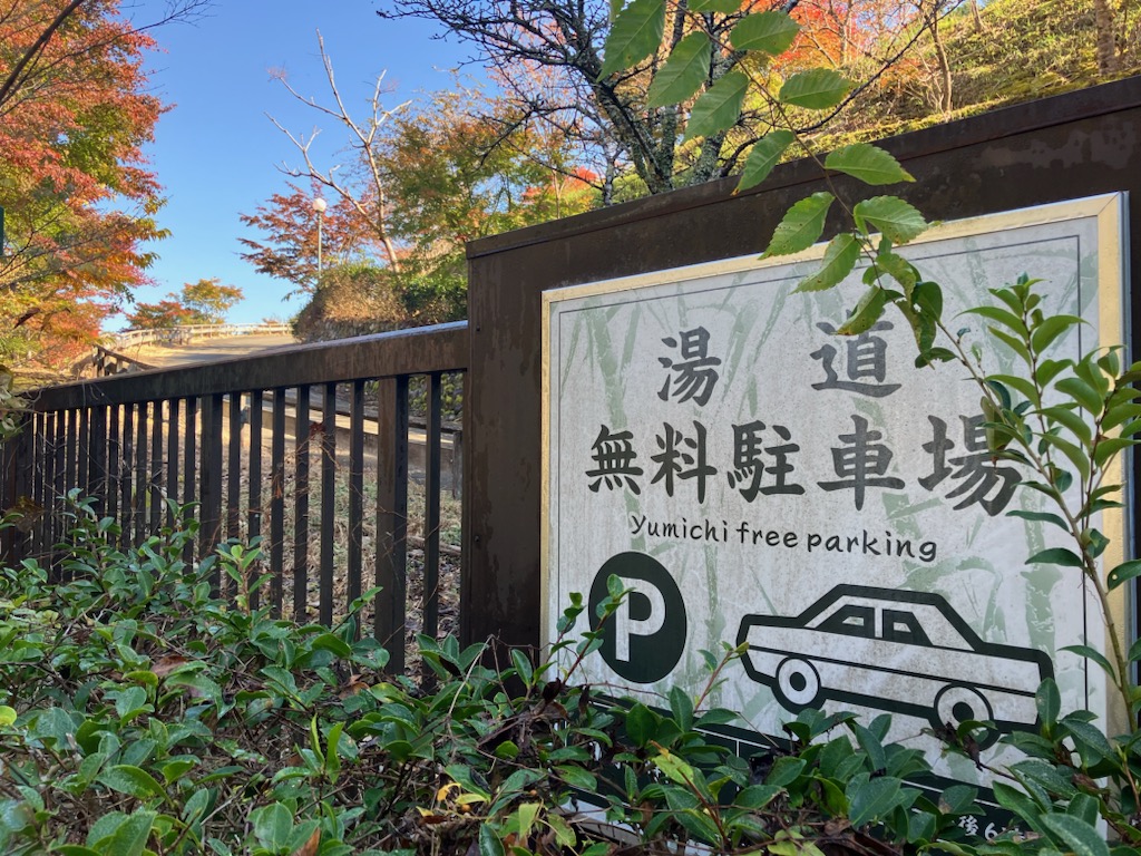 ↑ シメシメ・・😊😊👍 「湯道」の無料駐車場はガラガラ・・老後の身としては、この「無料駐車場」というのが大切・・節約節約・・😜😜 色付いた紅葉のお出迎え 😊😊