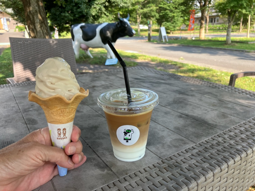 帰りは山中湖を通って御殿場に出ると、イベントの関係で渋滞していると嫌なので、このまま富士宮方面に向かい、「富士山こどもの国」を通って十里木から裾野へ出ることにした 🚐 🚐 🚐 途中「道の駅 朝霧」のフードパークにある「朝霧牛乳」でおやつ 😊「朝霧牛乳カフェオレ」&「コーヒーソフトクリーム🍦🍦」・・・😊😊👍