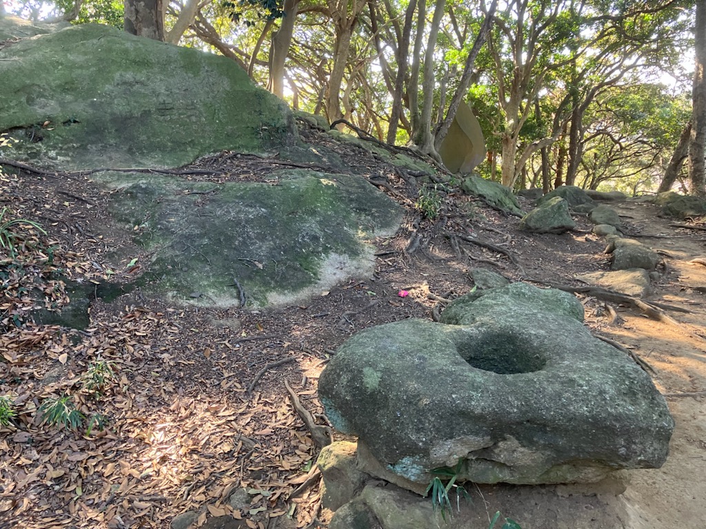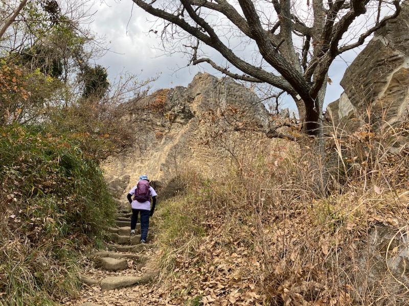 ↑ 凝灰岩が切り出された山ということで、登山道には多くの石や、削り出された跡が多く残っていて、階段や足場も削りやすい凝灰岩を削って作られている所が多かった