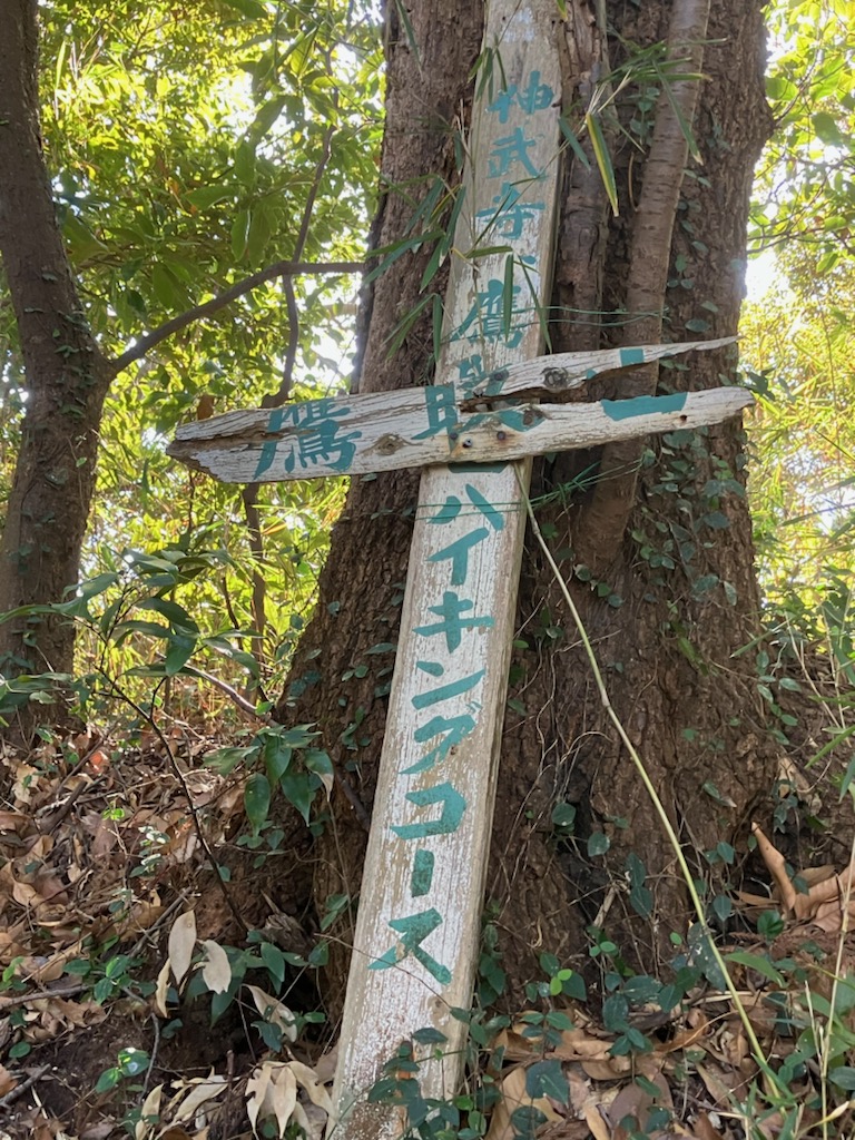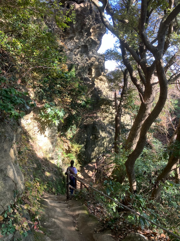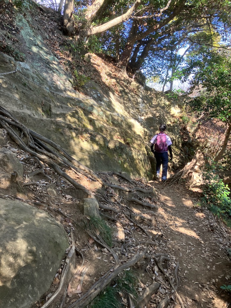 ↑ 話しながら下山したので、どこかで分岐を間違えてとんでもない急な下りの登山道を歩いてしまった・・・💦💦💦 太いロープも設置してあり、もうここまで下ってしまったら引き返すのもままならない・・😭😭 ピンクのテープもあるしきっとまた合流するだろうと下って行ったら、何と「神武寺」と「逗子中学校と神武寺駅方面」の分岐に・・💦💦💦 「神武寺」を通り越して、かなり下の方に出てしまい、「神武寺」へはまた登る羽目になってしまった・・・😭😭😭